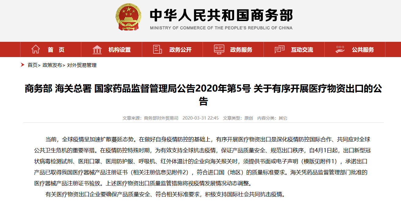 商务部、海关总署、药监联合发布2020第5号公告,即日4月1日起执行,新规对于我国出口医疗防疫物资将有新的管理标准要求。